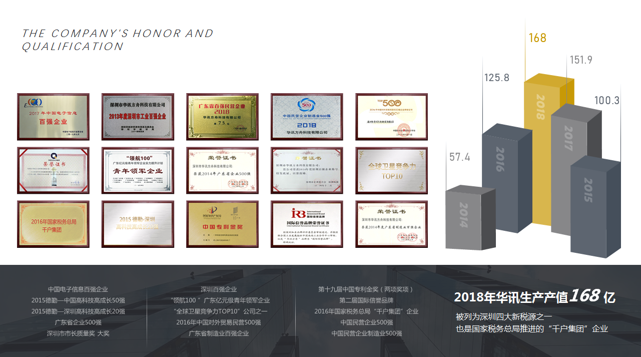 華訊方舟集團的發展已經駛入了快車道,連續多年保持著高速增長,引起社會各界的持續關注。公司先后榮獲了深圳市工業百強企業,廣東省制造業百強企業,廣東省五百強企業,中國軟件業務收入百強企業,德勤中國高科技、高成長50強,德勤深圳高成長20強,深圳市市長質量獎等多項殊榮。